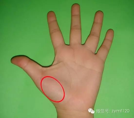 位置:人的手掌正面拇指根部,下至掌跟,伸开手掌时明显突起的部位。